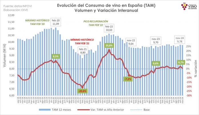 El consumo aparente de vino en España ha aumentado un leve 0,7% en el interanual a noviembre de 2024, alcanzando los 9,78 millones de hectolitros, según los datos del sistema de información INFOVI, mediante el cual los operadores declaran sus salidas de vino y mosto al Ministerio de Agricultura, Pesca y Alimentación.