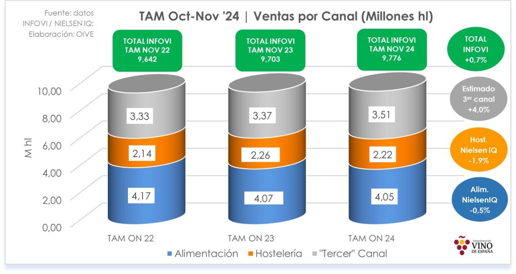 En cifras absolutas, según los datos de Nielsen IQ de los últimos 12 meses (TAM Oct-Nov 2024), las ventas de vino en los canales de alimentación y hostelería se situaron en 6,27 millones de hectolitros, lo que en valor se traduce en unas ventas totales de 3.182,6 millones de euros, dando lugar a un precio medio de 5,08 €/litro, un 2% superior al precio medio del mismo periodo del año anterior (4,98 €/litro).
