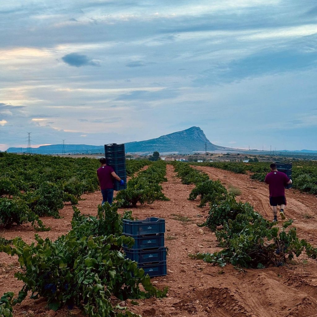 Las altas temperaturas registradas en agosto y septiembre provocaron un ligero adelanto en el calendario de recolección respecto a la media de años anteriores. Las primeras variedades blancas comenzaron a vendimiarse a finales de agosto, mientras que las tintas como la garnacha tintorera y la monastrell iniciaron la recolección durante la primera quincena de septiembre. Este adelanto permitió cosechar en un momento óptimo de madurez, conservando el equilibrio natural entre grado alcohólico y acidez.